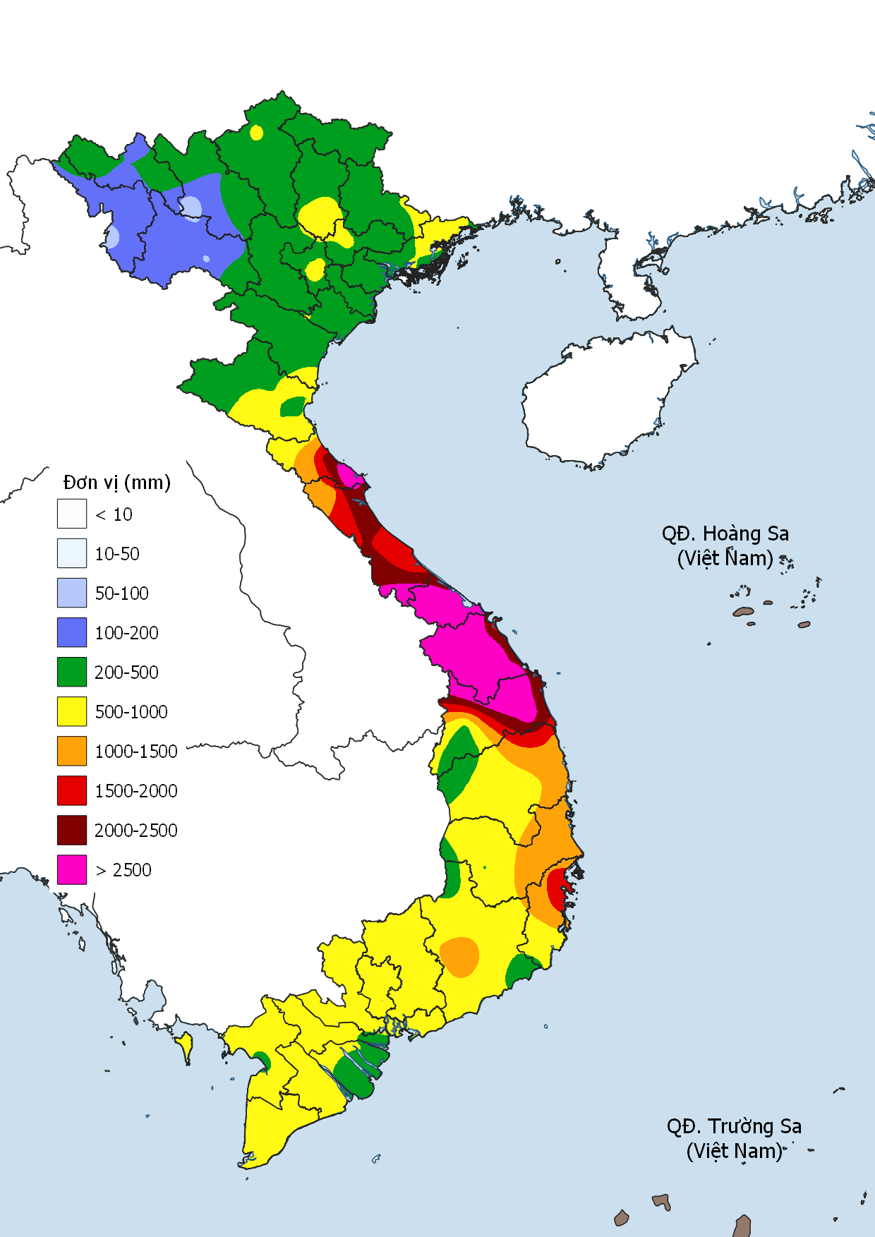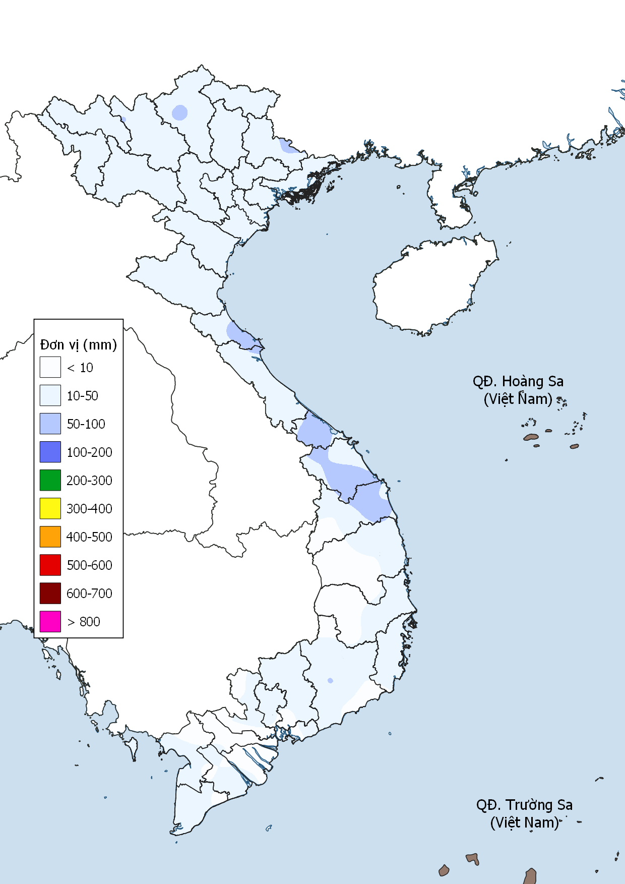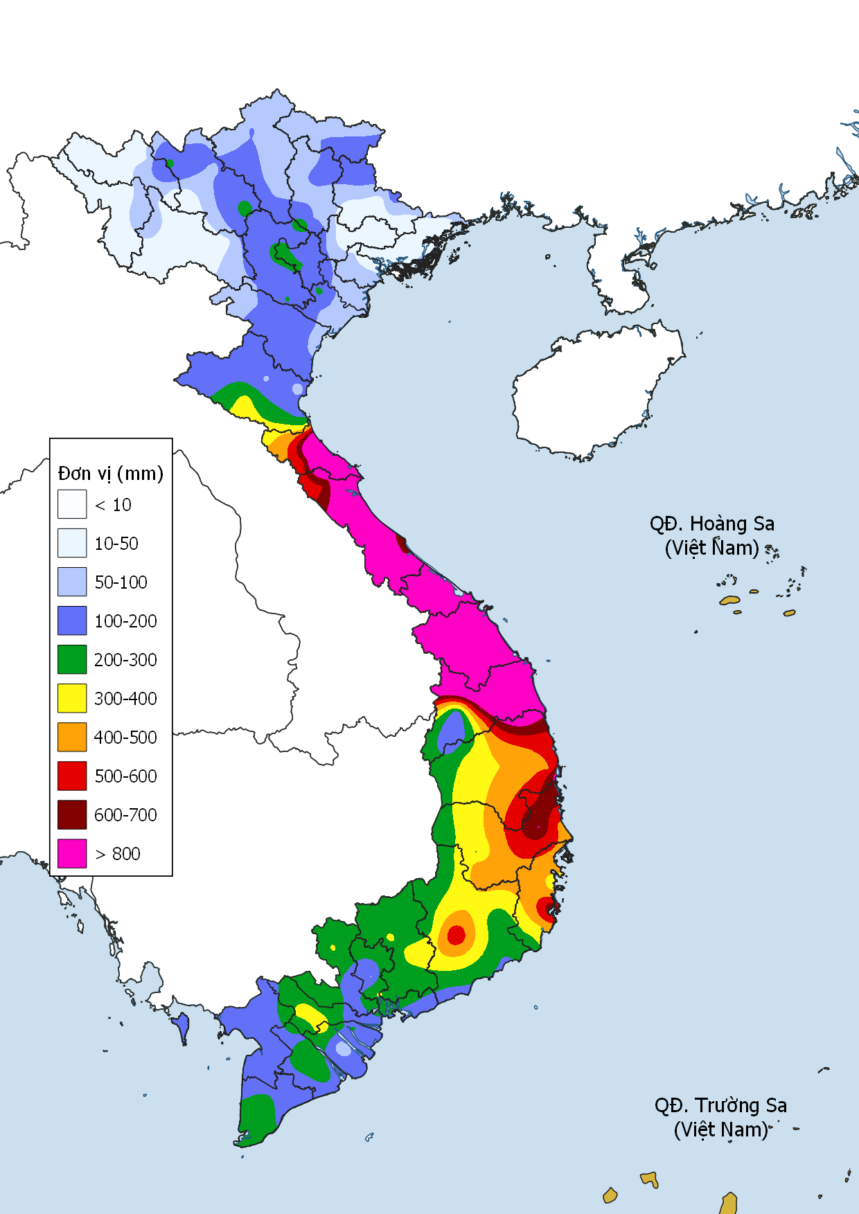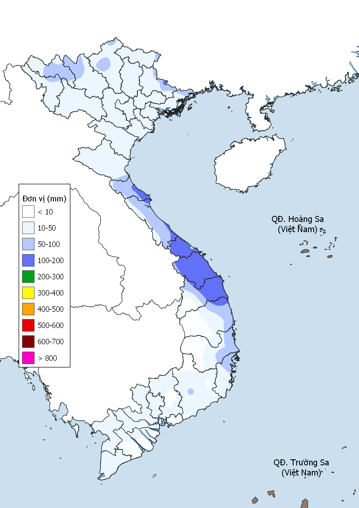 • Trung Bộ: Trung Bộ xuất hiện khoảng 4 đợt mưa diện rộng do gió mùa Đông Bắc, nổi bật là đợt mưa lớn 3–5/12. Mưa tập trung từ Quảng Trị đến Khánh Hòa, nhiều nơi mưa rất to trên 100mm/24h. TLM Thanh Hóa – Hà Tĩnh khoảng 20–80mm; Quảng Trị – Lâm Đồng 100–300mm; riêng Quảng Nam – Quảng Ngãi và Khánh Hòa 300–600mm, có nơi trên 800mm.