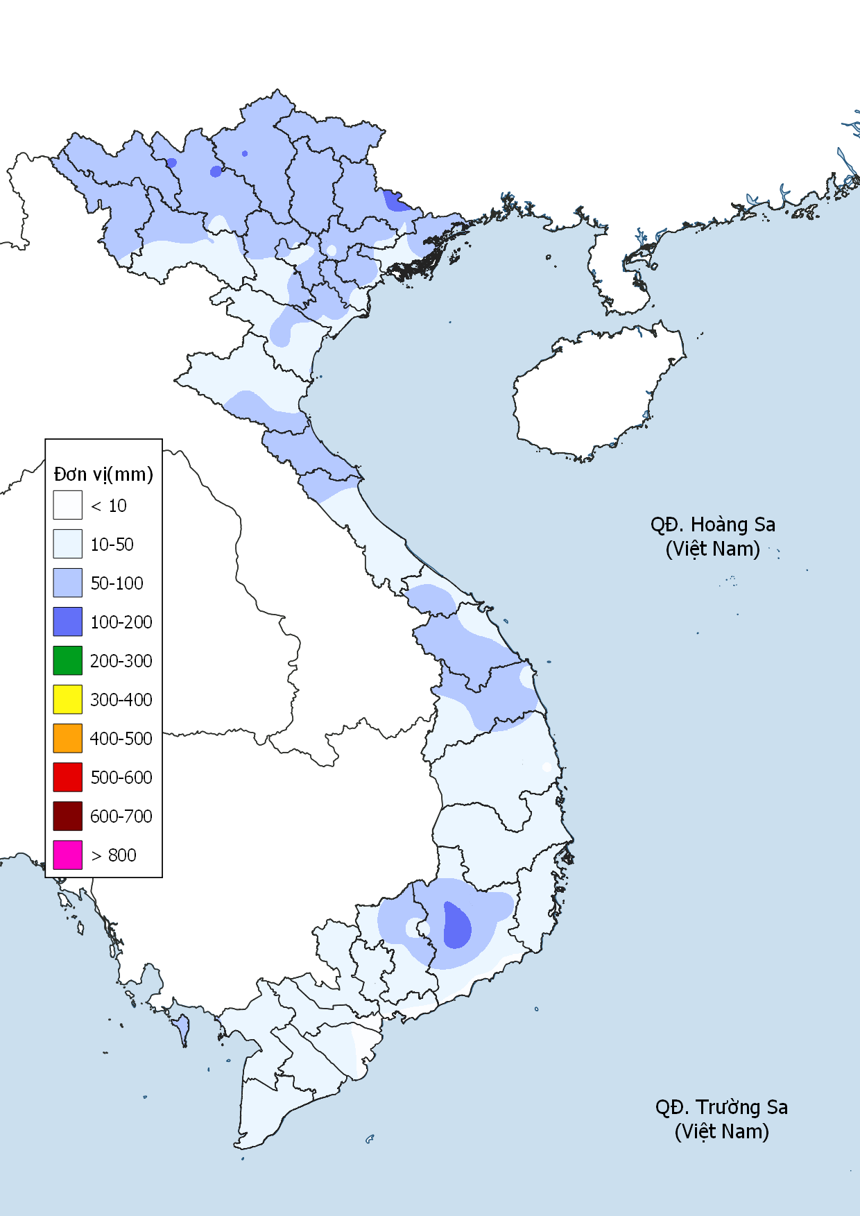 • Trung Bộ: Lượng mưa phổ biến 10-50mm, riêng Hà Tĩnh – Quảng Ngãi lượng cao hơn từ 30-80mm, có nơi cao hơn. Trong tháng dự báo có khoảng 2 đợt mưa rào xảy ra ở Hà Tĩnh – Quảng Ngãi.